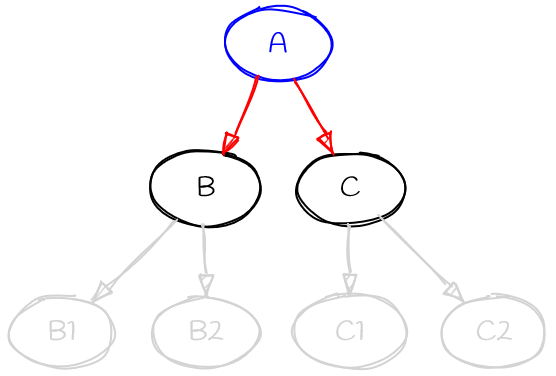 When the provider is asked to choose between the red requirements (A->B and A->C) it doesn’t know anything about the dependencies of B or C (i.e., the grey parts of the graph).