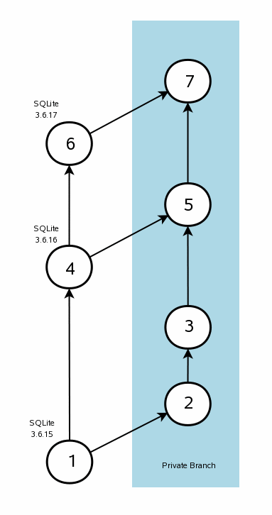 The cycle above can be repeated many times. The diagram shows a third SQLite release, 3.6.17 in circle (6). The private branch maintainer can do another merge in order to incorporate the changes moving from (4) to (6) into the private branch, resulting in version (7).